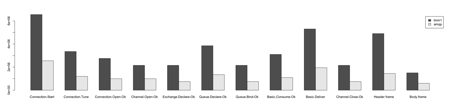 I'm not going to write about technical details of these benchmarks, get the sources and take a look yourself. I run every example 50,000 times, except of the example for the AMQP preamble which I run 200,000 times.